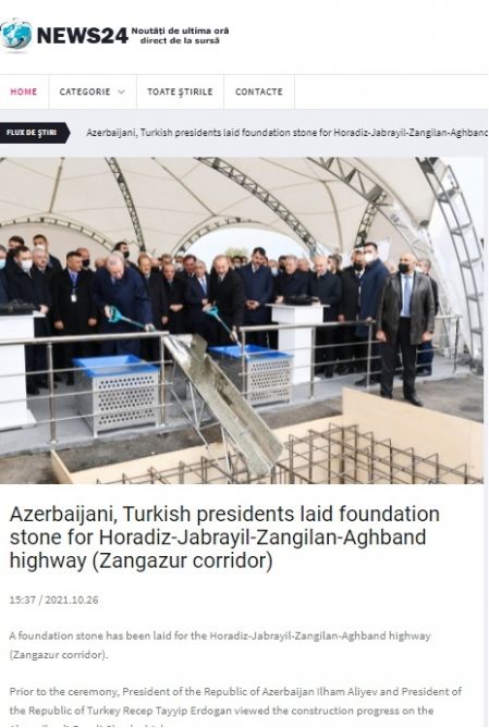 Rumıniyanın “News24hours” xəbər portalında Azərbaycan Prezidenti İlham Əliyevin və Türkiyə Prezidenti Rəcəb Tayyib Ərdoğanın Füzuli Beynəlxalq Hava Limanının açılışı mərasimindəki iştirakı barədə yazı dərc olunub.