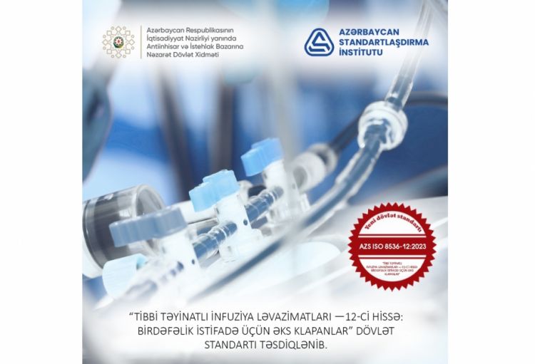 İqtisadiyyat Nazirliyi yanında Antiinhisar və İstehlak Bazarına Nəzarət Dövlət Xidmətinin tabeliyində olan Azərbaycan Standartlaşdırma İnstitutu (AZSTAND) tərəfindən beynəlxalq standart əsasında AZS ISO 8536-12:2023 “Tibbi təyinatlı infuziya ləvazimatları - 12-ci hissə: Birdəfəlik istifadə üçün əks klapanlar” dövlət standartı qəbul edilib.