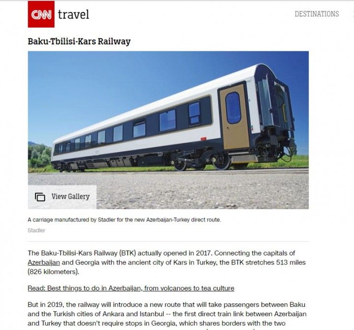 Amerikanın nüfuzlu CNN telekanalı Bakı – Tbilisi - Qars dəmir yolunu səyahətlər haqqında təsəvvürləri dəyişə biləcək yeni dəmir yol marşrutlarının siyahısına daxil edib.