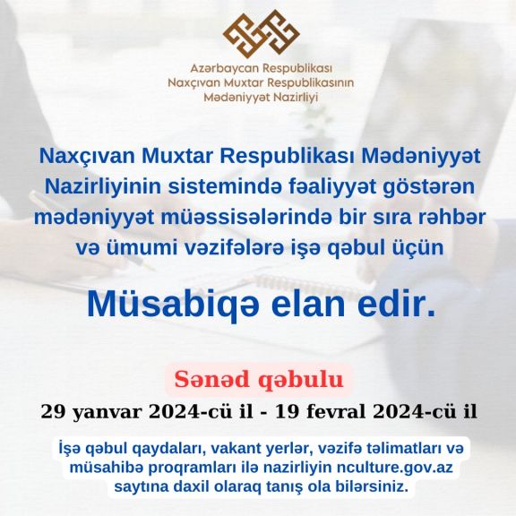 Naxçıvan Muxtar Respublikasının Mədəniyyət Nazirliyinin sistemində fəaliyyət göstərən mədəniyyət müəssisələrində bir sıra rəhbər və ümumi vəzifələrə işə qəbul üçün müsabiqə elan edir. Nazirlikdən NUHÇIXAN-a verilən məlumata görə, müsabiqəyə sənəd qəbulu 29 yanvar 2024-cü il tarixdən 19 fevral 2024-cü il tarixinədək həyata keçiriləcək.