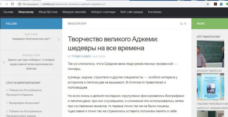 Daşkənddəki uchildiz.uz portalında böyük Azərbaycan memarı Əcəmi haqqında rus dilində “Böyük Əcəminin yaradıcılığı: bütün dövrlərin şedevri” sərlövhəli geniş məqalə yer alıb.