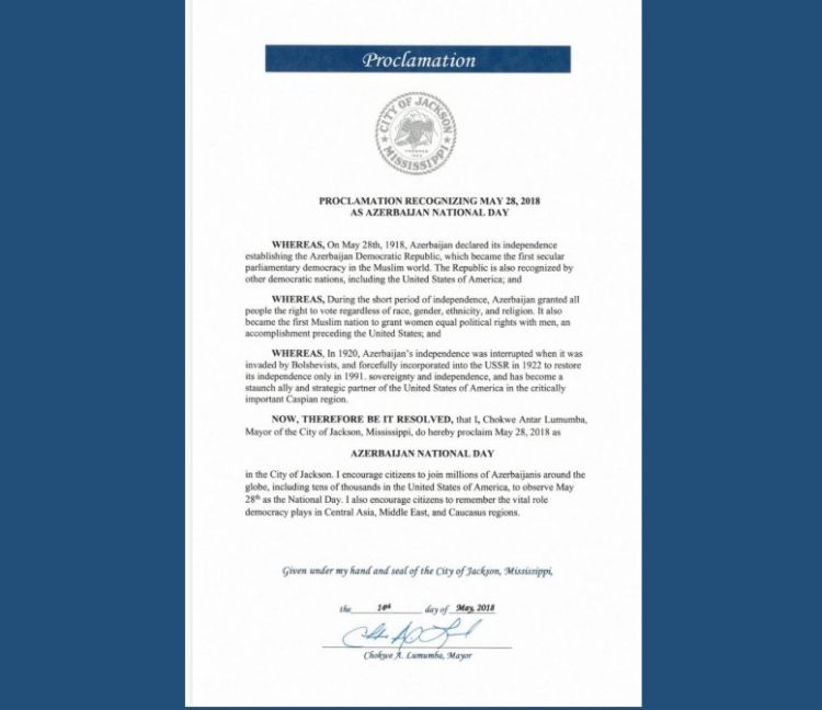 ABŞ-ın Missisipi ştatının paytaxtı və ən böyük şəhəri olan Cəksonun meri Çokvi Antar Lumumba Azərbaycan Xalq Cümhuriyyətinin qurulmasının 100 illik yubileyi münasibətilə rəsmi bəyannamə imzalayıb.