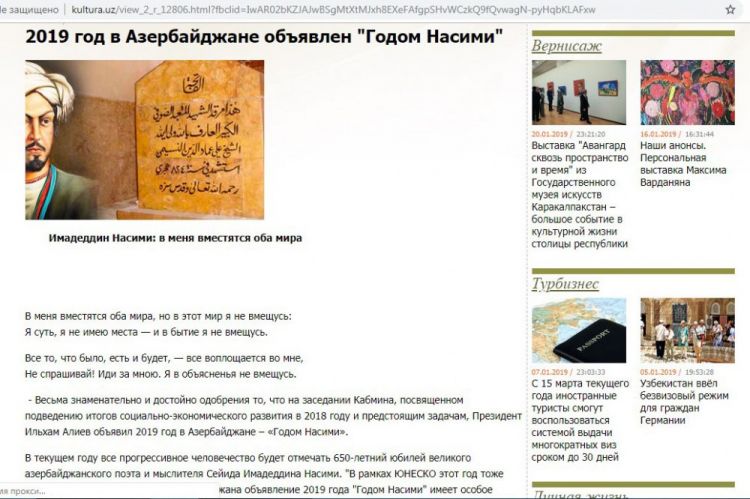 Özbəkistanın kultura.uz portalında Azərbaycanda “Nəsimi İli” elan olunması ilə bağlı rus dilində “İmadəddin Nəsimi: məndə sığar iki cahan” sərlövhəli məqalə yerləşdirilib.