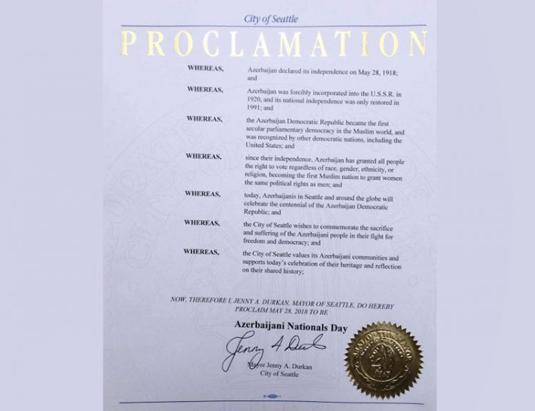 ABŞ-ın Vaşinqton ştatının ən böyük yaşayış məntəqəsi olan Sietl şəhərinin meri Cenni Durkan Azərbaycan Xalq Cümhuriyyətinin yaranmasının 100 illiyi ilə əlaqədar bəyannamə imzalayıb.
