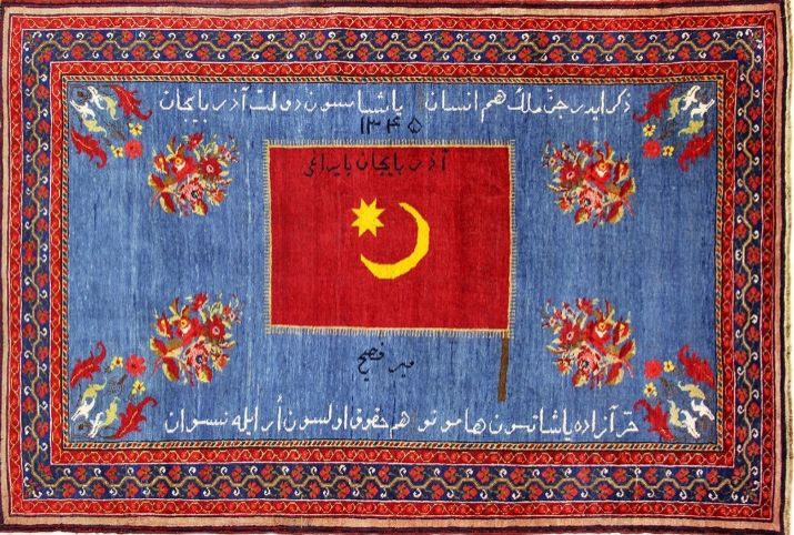 Azərbaycan Xalq Cümhuriyyətinin 21 iyun - 9 noyabr 1918-ci il tarixlərini əhatə edən ilk bayrağı xalq ustaları tərəfindən xalça üzərində əbədiləşdirilib. Xalçanın yazıları və təsvirləri ərəb kalliqrafiyasının qaydalarına müvafiq şəkildə soldan sağa doğru toxunub. Bu sənət əsərinin üzərində onun hicri tarixi ilə 1345-ci ildə (miladi tarixi ilə 1926-cı il) toxunduğu qeyd olunub. Türkçülüyün əbədi rəmzi olan mavi rəngli arasahənin mərkəzində təsvir olunmuş qırmızı rəngli, ay-ulduz təsvirli bayrağın üzərində "Zikr edər cinnü-mələk həm insan.Yaşasın devletü Azərbaycan" və "Hür azade yaşatsun hamunu. Hem hüquq olsun er ile nisvan" misraları yazılıb.