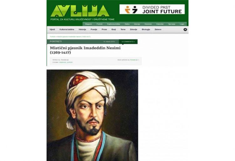NUHÇIXAN xəbər verir ki, Azərbaycan şairi İmadəddin Nəsiminin 650 illik yubileyi ilə bağlı www.avlija.me portalında şairin həyat və yaradıcılığı haqqında geniş məqalə dərc edilib. Məqalədə, həmçinin Prezident İlham Əliyevin bu ili “Nəsimi ili” elan etməsi xüsusi qeyd edilib.