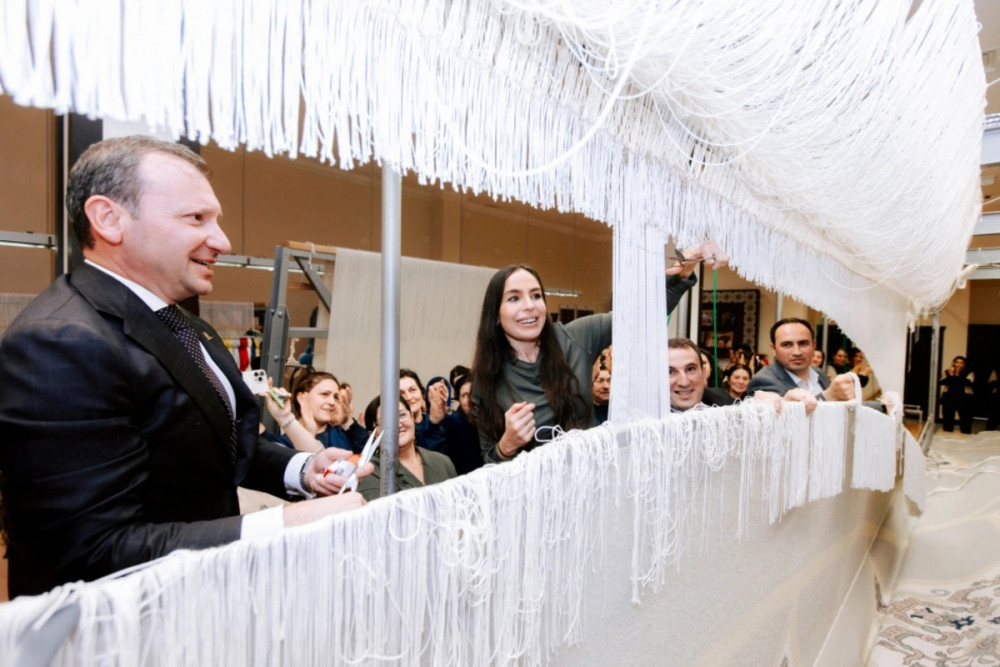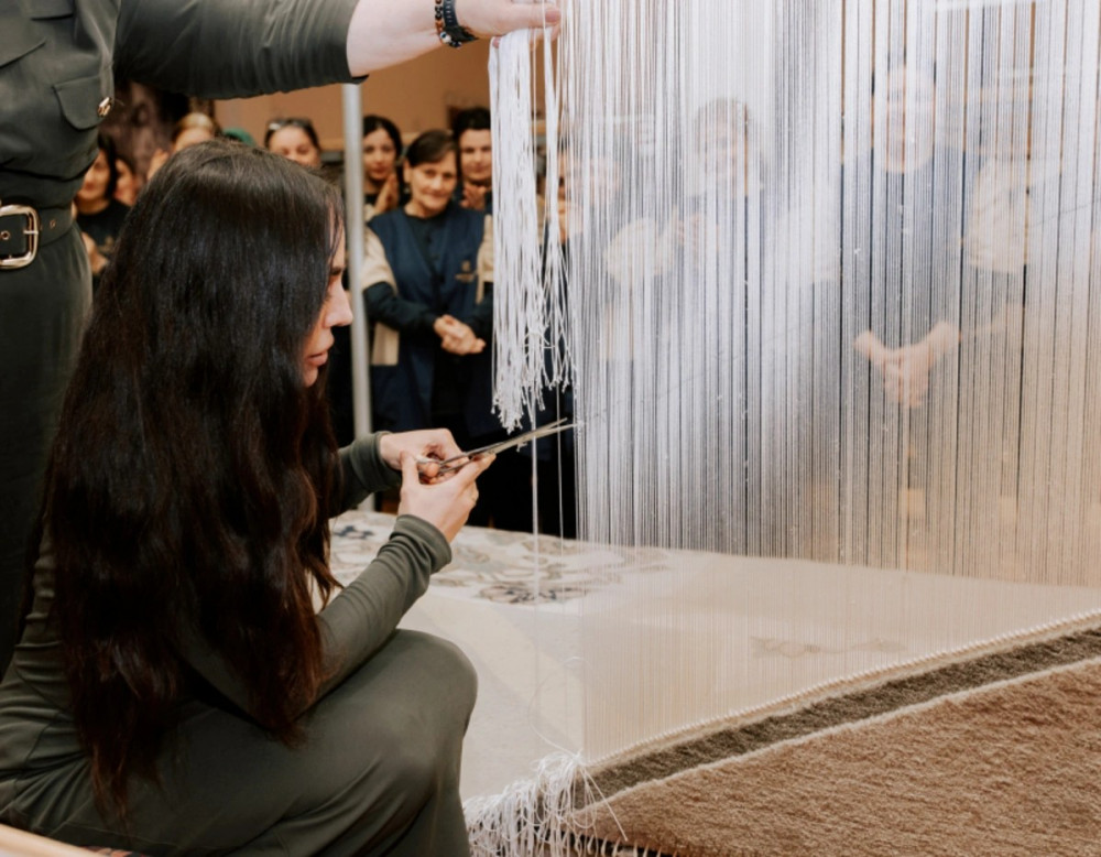 "Azərxalça"nın Şuşa məscidi üçün hazırladığı dairəvi əl xalçasının kəsim mərasimi olub - FOTOLAR