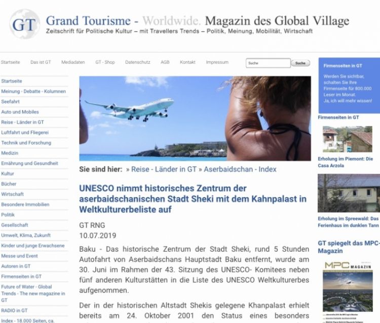 “Grand Tourisme” qəzetində Azərbaycanın Xan Sarayı və Şəkinin tarixi mərkəzinin UNESKO-nun Dünya İrs Siyahısına daxil edilməsinə dair məqalə dərc olunub.