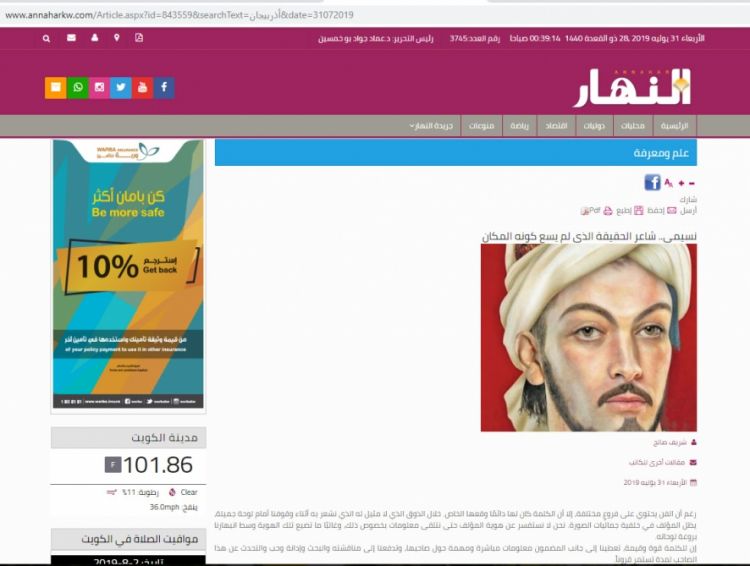 Küveytdə gündəlik ərəb dilində nəşr edilən “Əl-Nahar” qəzetində “Nəsimi.. :“Kövnü məkana sığmayan həqiqət şairi” sərlövhəli məqalə dərc edilib.