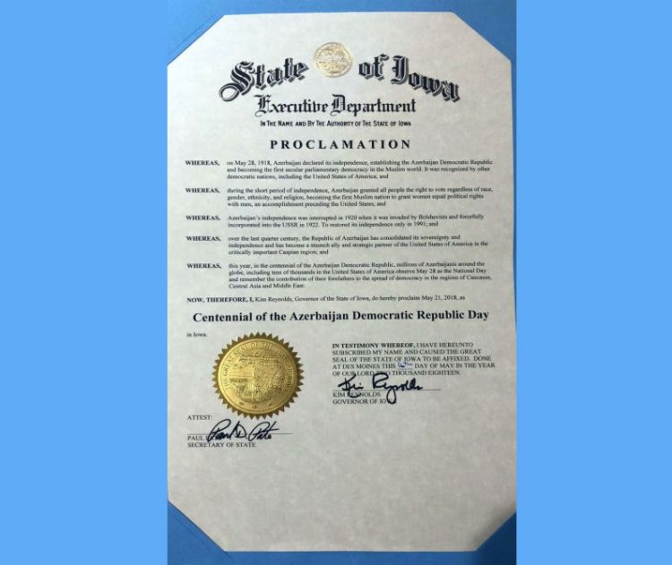 ABŞ-ın Ayova ştatının qubernatoru Kim Reynolds Azərbaycan Xalq Cümhuriyyətinin yaranmasının 100 illiyi ilə bağlı bəyannamə imzalayıb.