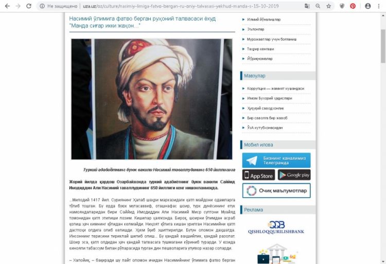 Özbəkistan milli informasiya agentliyi (UzA) dahi Azərbaycan şairi İmadəddin Nəsiminin 650 illiyi ilə bağlı özbək dilində geniş məqalə dərc edib.