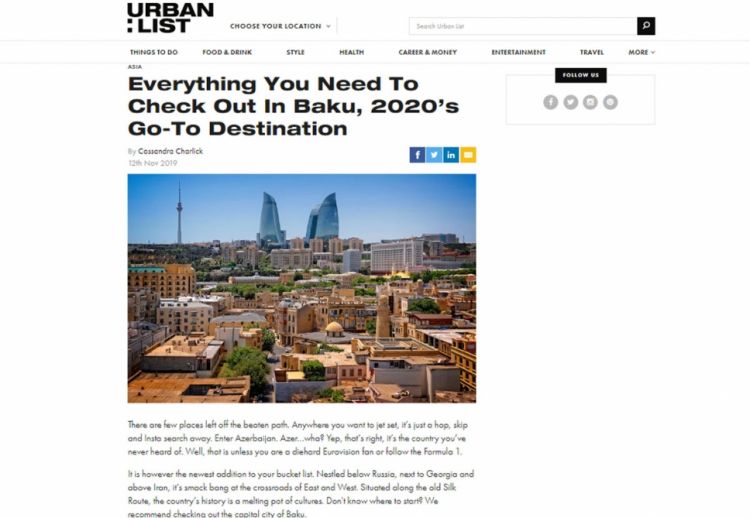 Avstraliyanın populyar “www.theurbanlist.com” saytında cari ilin sentyabrında Azərbaycana səfər edən avstraliyalı jurnalist və bloqer Kassandra Çarlikin “Everything You Need To Check Out In Baku, 2020’s Go-To Destination” sərlövhəli məqaləsi dərc olunub.