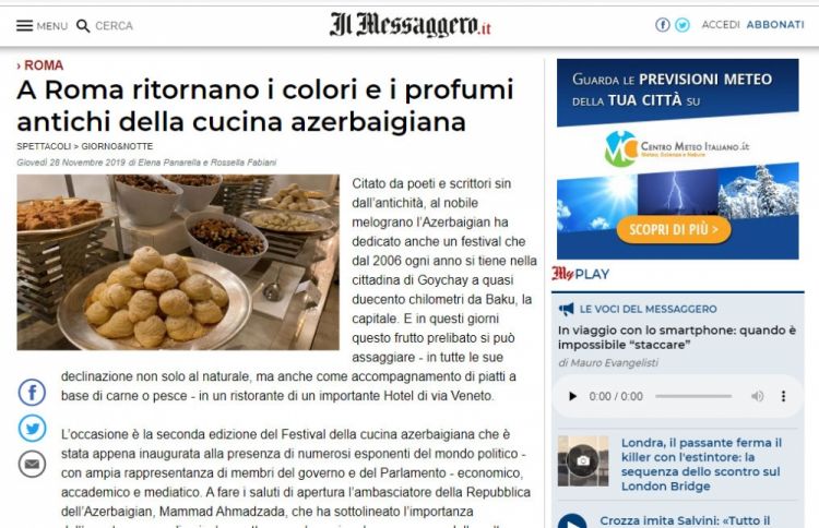 Romanın “Westin Excelsior Rome” otelində Heydər Əliyev Fondunun dəstəyi, Azərbaycanın İtaliyadakı səfirliyi və İtaliya-Azərbaycan Ticarət Palatasının birgə təşkilatçılığı ilə keçirilmiş ikinci Azərbaycan Mətbəxi Festivalı İtaliya mətbuatının gündəmindədir.