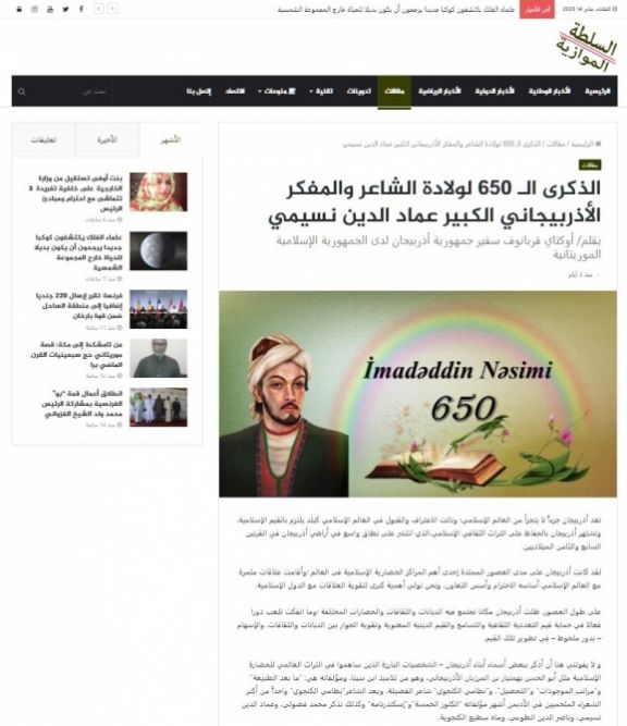 Mavritaniyanın “El Moltagha” və “Sulta Məvaziyə” xəbər portalında böyük Azərbaycan şairi və mütəfəkkiri İmadəddin Nəsimiyə həsr olunmuş məqalə dərc edilib.