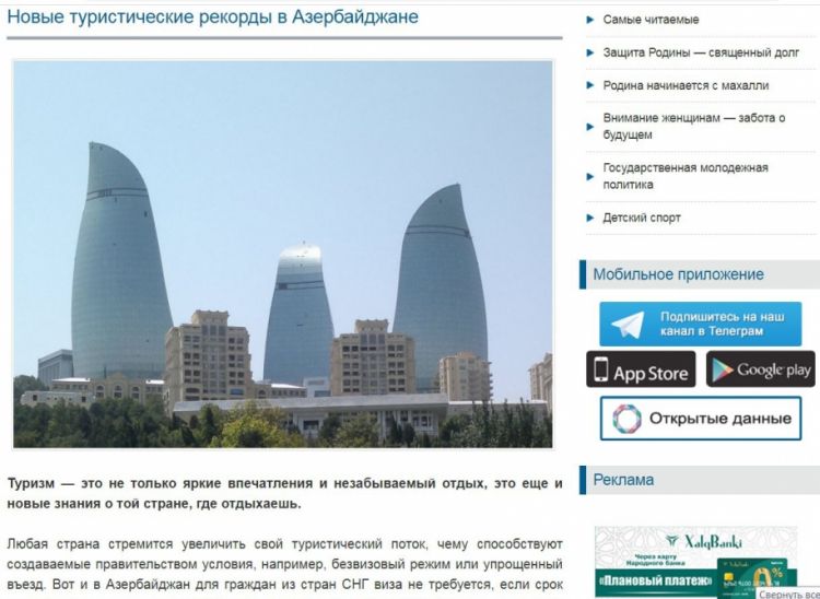 UzA Milli İnformasiya Agentliyinin saytında “Azərbaycanın yeni turizm rekordu” sərlövhəli yazı yerləşdirilib