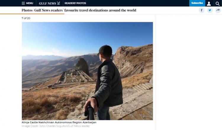 NUHÇIXAN xəbər verir ki, məhşur gulfnews.com saytı dünyanın 20-i ölkəsindən oxucuların göndərdikləri fotoları "Photos: Gulf News readers' favourite travel destinations around the world" (Şəkillər: Gulf News oxucularının dünyanın ən sevimli səyahət yerləri) başlığı ilə paylaşıb. John Charles adlı oxucunun Əlincə qalasından çəkib göndərdiyi fotosu isə 20-i foto arasında 7-ci yerdə qərarlaşıb.