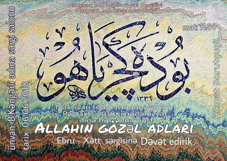 NUHÇIXAN xəbər verir ki, iyulun 6-sı saat 11:00-da Naxçıvan Muxtar Respublikası Rəssamlar Birliyinin Bəhruz Kəngərli adına sərgi salonunda “Naxçıvan İslam Mədəniyyətinin Paytaxtı-2018” mədəniyyət ilinə həsr olunmuş görkəmli “Ebru” ustası,Türkiyə Böyük Millət Məclisinin sənət üzrə müşaviri Hikmət Barutçugilin əsərlərindən ibarət "Allahın gözəl adları" adlı fərdi yaradıcılıq sərgisi keçiriləcək. Ekspozisiyada rəssamın 47 ebru üzərində xətt sənətinin ahəngdar nümunələri sərgilənəcək. Ebruda “Esma-i Hüsna” adlı bu sərgi ilk öncə Türkiyənin bir çox şəhərlərində və Naxçıvan Muxtar Respublikasından başlayaraq Azərbaycanın digər bölgələrində nümayiş olunacaq.