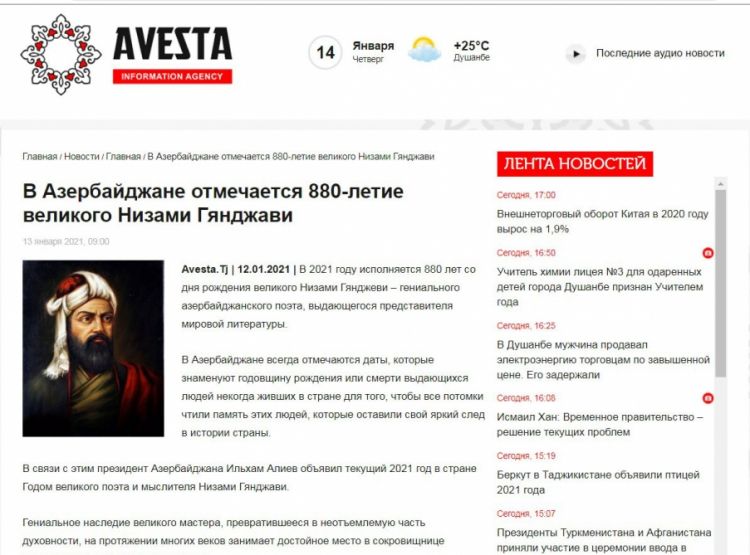 Tacikistanın “avesta.tj” portalı böyük Azərbaycan şairi Nizami Gəncəvinin 880 illiyi ilə bağlı rus dilində geniş məqalə çap edib.