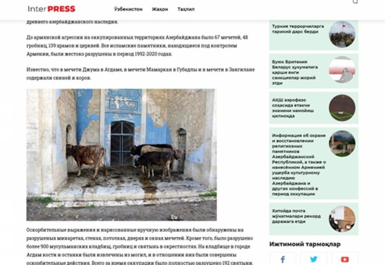 Özbəkistanın “interpress.uz” portalı işğaldan azad olunan ərazilərimizdə Ermənistan tərəfdən Azərbaycanın mədəni irsinin, mədəniyyət və dini abidələrinin dağıdılmasından yazır.
