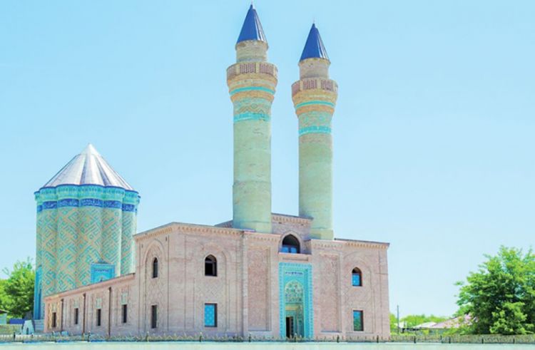 Qoşa minarə. 700 illik mədəniyyət məbədimizin qoşa minarəsi və onları birləşdirən baştağ. Tarixi araşdırmalar hələ qoşa minarələrin daha qədim olduğunu göstərir – XII-XIII əsrlər. Baştağ isə XIV əsrin yadigarıdır. Kompleksin bu hissəsində müxtəlif hücrə otaqlar yerləşir. Həmin hücrələrin mədrəsə kimi istifadə edildiyinə aid məlumatlar var. 700 illik mədrəsə mədəniyyəti. Elmin, təhsilin dərin köklərinə dair canlı bir şahid.