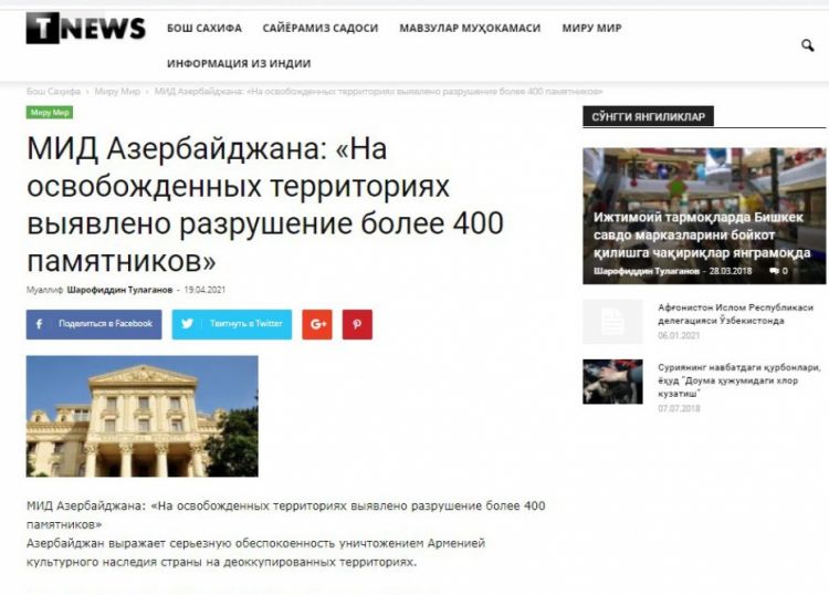 Özbəkistanın “tnews.uz” portalı öz səhifəsində rus dilində “Azərbaycan Xarici İşlər Nazirliyi: Azad olunan ərazilərdə 400-dən çox abidə dağıdıldığı aşkar edilib” sərlövhəli məqalə yerləşdirib.