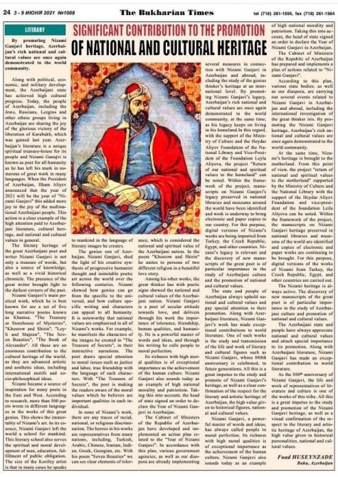ABŞ-ın Nyu-York şəhərində nəşr edilən “Bukharian Times” qəzetində Azərbaycanın Diaspor Fəaliyyətinə Jurnalistlərin Dəstəyi İctimai Birliyinin sədri Fuad Hüseynzadənin “Milli-mədəni irsin təbliğinə əhəmiyyətli töhfə” adlı məqaləsi dərc olunub.
