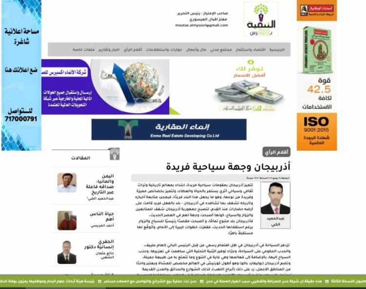 Yəmənin “Əl Tənmiyə Əl Yom” qəzetində jurnalist Əbdül Həmid Əl-Kibinin “Azərbaycanın geniş turizm potensialı” sərlövhəli məqaləsi dərc olunub.
