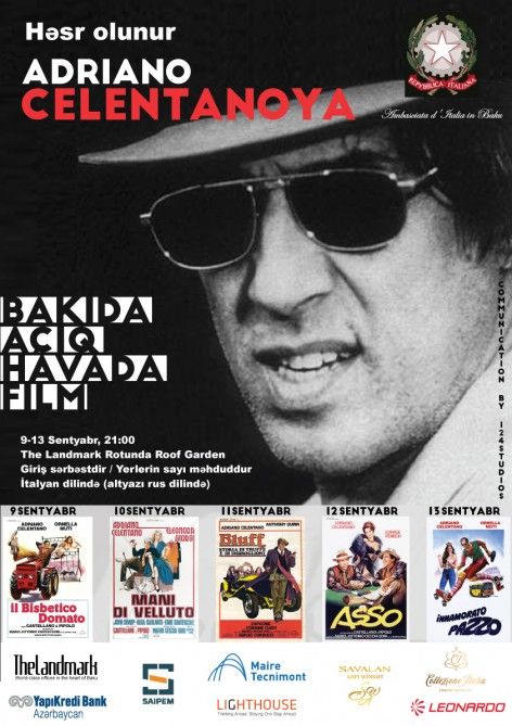 Sentyabrın 9-dan 13-dək Bakıda Adriano Çelentanonun 80 illik yubileyinə həsr olunan “Adriano Çelentano açıq hava film festivalı” keçiriləcək.