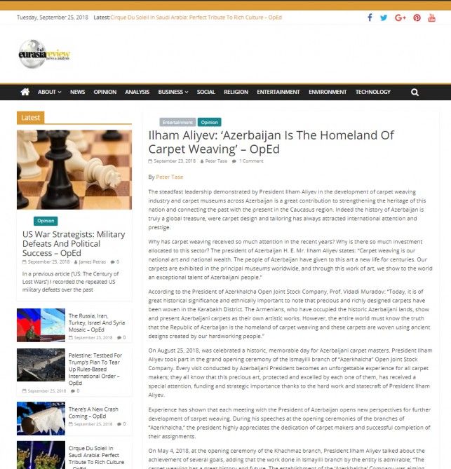 "Azərxalça" Açıq Səhmdar Cəmiyyətinin mətbuat xidmətindən NUHÇIXAN-a bildirilib ki, Amerika Birləşmiş Ştatlarında nəşr olunan "Eurasia review" jurnalında və eyniadlı analitik portalda Azərbaycan xalçaçılığından, ölkəmizdə bu sahənin inkişafı istiqamətində həyata keçirilən tədbirlərdən, "Azərxalça" Açıq Səhmdar Cəmiyyətinin fəaliyyətindən bəhs edən məqalə dərc olunub. "Azərbaycan xalçaçılığın vətənidir" adlı məqalənin müəllifi tanınmış jurnalist və beynəlxalq münasibətlər üzrə ekspert Peter Tasedir. Məqalədə Azərbaycanın xalçaçılıq tarixinə nəzər salınıb.