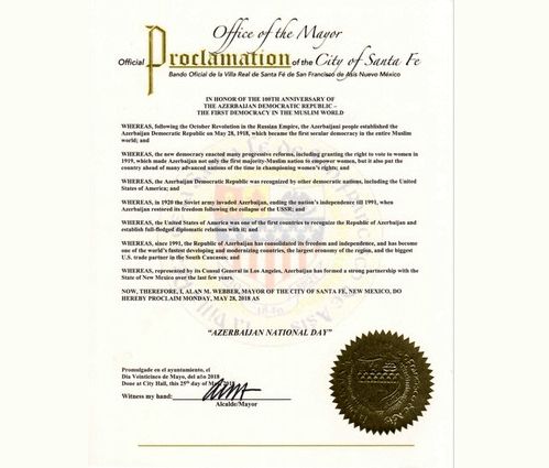 ABŞ-ın Nyu-Meksika ştatının paytaxtı Santa Fe şəhəri 28 may 2018-ci il tarixini “Azərbaycan Milli Günü” elan edib.