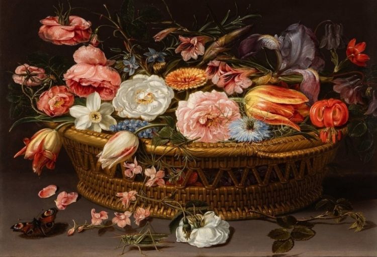 NUHÇIXAN xəbər verir ki, rəsm əsərinin tam adı “Qızılgül, qərənfil, zanbaq, nərgiz, iris, dumanda sevgi, xəndəkotu və üzəri kəpənək və işıldaquş ilə bağlı toxunmuş səbətdə olan digər çiçəklər”dir. Kətanın üzərində toxunmuş səbətin içərisində parlaq çəhrayı, ağ və sarı çiçəklər təsvir olunub. Onların bir neçəsi solub, kəpənək və işıldaquş isə ləçəklərin arasında yer alıb.