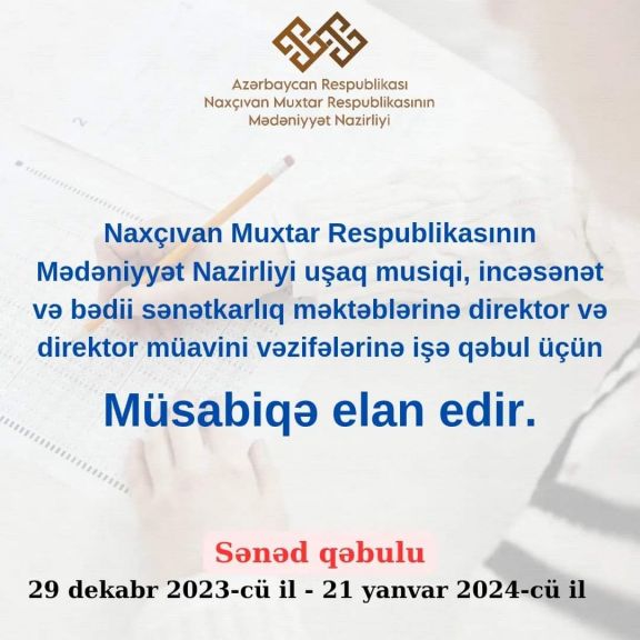 Naxçıvan Muxtar Respublikasının Mədəniyyət Nazirliyi uşaq musiqi, incəsənət və bədii sənətkarlıq məktəblərinə direktor və direktor müavini vəzifələrinə işə qəbul üçün müsabiqə elan edib.