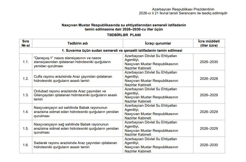 "Naxçıvan Muxtar Respublikasında su ehtiyatlarından səmərəli istifadənin təmin edilməsinə dair 2026−2030-cu illər üçün Tədbirlər Planı" təsdiq edilib.