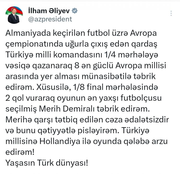 Prezident İlham Əliyev Merih Demirala qarşı tətbiq edilən cəzanı ədalətsiz adlandırıb, Türkiyə millisinə uğurlar arzulayıb
