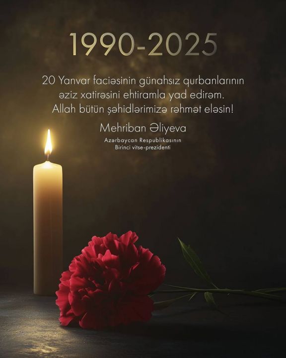 Azərbaycan Respublikasının Birinci vitse-prezidenti Mehriban Əliyeva sosial şəbəkə hesablarında 20 Yanvar faciəsinin 35-ci ildönümü ilə bağlı paylaşım edib.