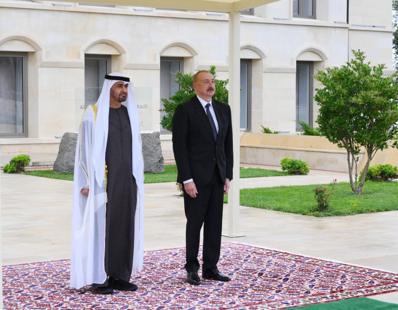 Fəxri qarovul dəstəsi hərbi marşın sədaları altında Azərbaycan Prezidenti İlham Əliyevin və Birləşmiş Ərəb Əmirliklərinin Prezidenti Şeyx Məhəmməd bin Zayed Al Nəhyanın qarşısından keçdi.