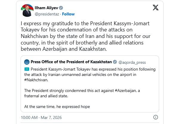 "İran dövləti tərəfindən Naxçıvana edilən hücumları qınadığına və Azərbaycan ilə Qazaxıstan arasında qardaşlıq və müttəfiqlik münasibətləri ruhunda ölkəmizə göstərdiyi dəstəyə görə Qazaxıstan Prezidenti Kasım-Jomart Tokayevə minnətdarlığımı bildirirəm", - deyə paylaşımda qeyd olunub.