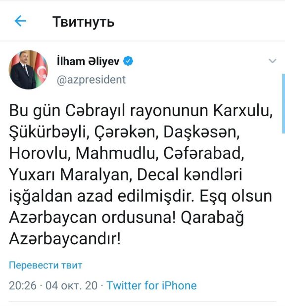 "Bu gün Cəbrayıl rayonunun Karxulu, Şükürbəyli, Çərəkən, Daşkəsən, Horovlu, Mahmudlu, Cəfərabad, Yuxarı Maralyan, Decal kəndləri işğaldan azad edilmişdir. Eşq olsun Azərbaycan ordusuna! Qarabağ Azərbaycandır!"