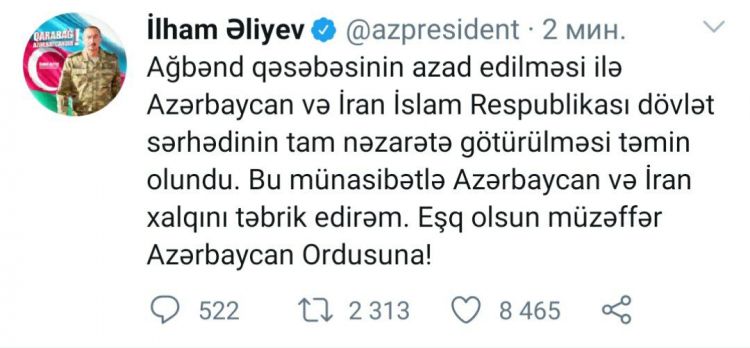 "Ağbənd qəsəbəsinin azad edilməsi ilə Azərbaycan və İran İslam Respublikası dövlət sərhədinin tam nəzarətə götürülməsi təmin olundu. Bu münasibətlə Azərbaycan və İran xalqını təbrik edirəm. Eşq olsun müzəffər Azərbaycan Ordusuna!".