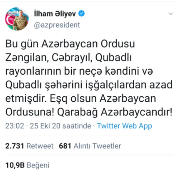 Bu gün Azərbaycan Ordusu Zəngilan, Cəbrayıl, Qubadlı rayonlarının bir neçə kəndini və Qubadlı şəhərini işğalçılardan azad etmişdir. Eşq olsun Azərbaycan Ordusuna! Qarabağ Azərbaycandır!
