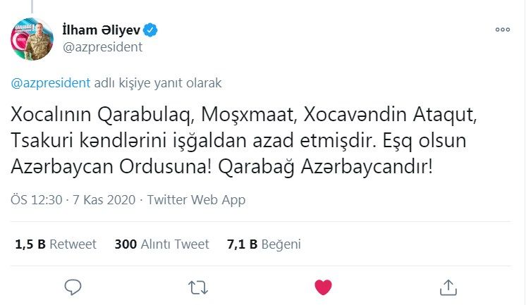 Xocalının Qarabulaq, Moşxmaat, Xocavəndin Ataqut, Tsakuri kəndlərini işğaldan azad etmişdir. Eşq olsun Azərbaycan Ordusuna! Qarabağ Azərbaycandır!