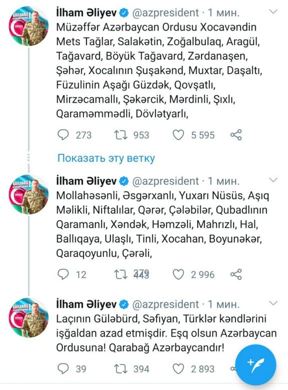 Müzəffər Azərbaycan Ordusu Xocavəndin Mets Tağlar, Salakətin, Zoğalbulaq, Aragül, Tağavard, Böyük Tağavard, Zərdanaşen, Şəhər, Xocalının Şuşakənd, Muxtar, Daşaltı, Füzulinin Aşağı Güzdək, Qovşatlı, Mirzəcamallı, Şəkərcik, Mərdinli, Şıxlı, Qaraməmmədli, Dövlətyarlı, Hacılı, Hüseynbəyli, Saracıq, Zəngilanın Sobu, Qaragöz, İsgəndərbəyli kəndlərini, Bartaz qəsəbəsini, Bartaz strateji yüksəkliyini (2300 metr), Sığırt yüksəkliyini (1370 metr), Şükürataz yüksəkliyini (2000 metr) və əlavə 5 adsız strateji yüksəkliyi, Cəbrayılın Qalacıq, Mollahəsənli, Əsgərxanlı, Yuxarı Nüsüs, Aşıq Məlikli, Niftalılar, Qərər, Çələbilər, Qubadlının Qaramanlı, Xəndək, Həmzəli, Mahrızlı, Hal, Ballıqaya, Ulaşlı, Tinli, Xocahan, Boyunəkər, Qaraqoyunlu, Çərəli, Laçının Güləbürd, Səfiyan, Türklər kəndlərini işğaldan azad etmişdir. Eşq olsun Azərbaycan Ordusuna! Qarabağ Azərbaycandır!