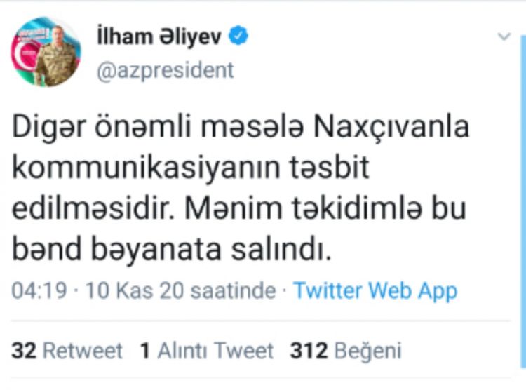 "Digər önəmli məsələ Naxçıvanla kommunikasiyanın təsbit edilməsidir. Mənim təkidimlə bu bənd bəyanata salındı".