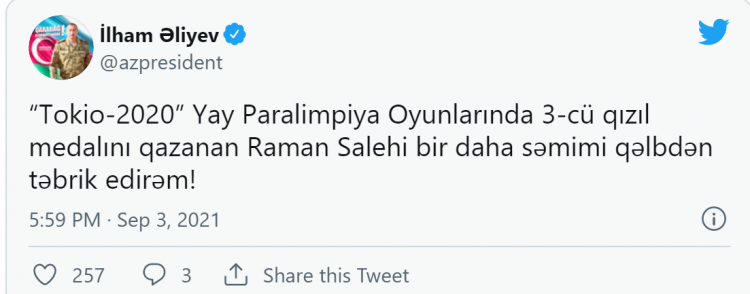 Prezident İlham Əliyev "Tokio-2020" Yay Paralimpiya Oyunlarında 3-cü qızıl medalını qazanan Raman Salehi təbrik edib.