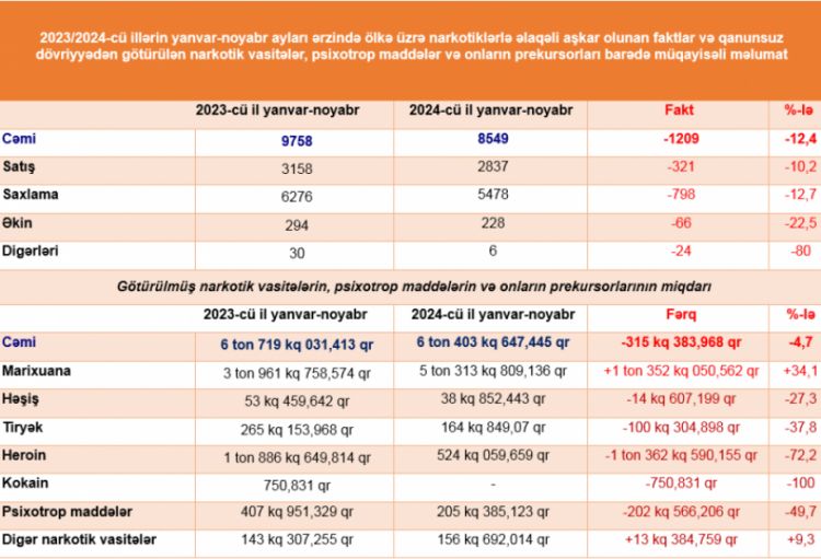Ötən ilin yanvar-noyabr ayları ilə müqayisədə 2024-cü ilin müvafiq dövründə narkotik vasitələrin və psixotrop maddələrin qanunsuz dövriyyəsi ilə bağlı hüquq-mühafizə orqanları tərəfindən aşkar edilən faktların sayı 1209, narkotiklərin qanunsuz satışı ilə bağlı faktların sayı 321, narkotiklərin satış məqsədi olmadan qanunsuz əldə edilib saxlanılması ilə əlaqədar faktların sayı 798, narkotik xassəli bitkilərin qanunsuz kultivasiya edilməsi ilə bağlı faktların sayı 66, digər növ cinayət faktlarının sayı 24, həmçinin qaçaqmalçılıqla bağlı cinayətlərin sayı 31 fakt, qanunsuz dövriyyədən çıxarılmış narkotik vasitələrin çəkisi 315 kiloqram 383,968 qram, məsuliyyətə cəlb edilmiş şəxslərin sayı isə 1073 nəfər azalıb. Bununla yanaşı, qrup halında olan cinayətlərin sayı 7 fakt artıb.