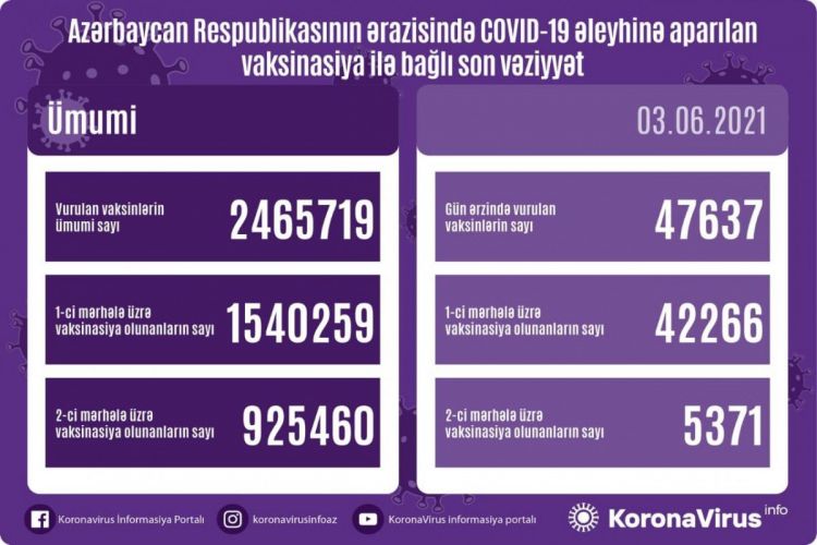 Ölkədə vurulan vaksinlərin ümumi sayı 2 465 719, birinci mərhələ üzrə vaksinasiya olunanların ümumi sayı 1 540 259, ikinci mərhələ üzrə vaksinasiya olunanların sayı isə 925 460 təşkil edir.