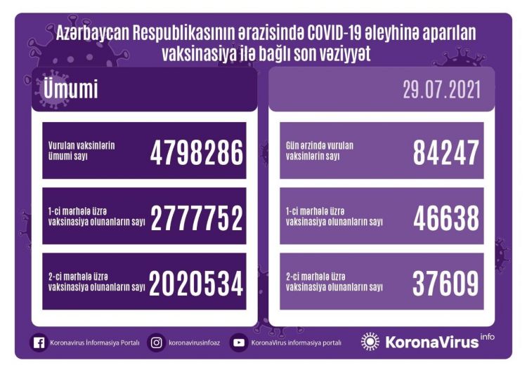 Ölkədə vurulan vaksinlərin ümumi sayı 4 798 286, birinci mərhələ üzrə vaksinasiya olunanların ümumi sayı 2 777 752, ikinci mərhələ üzrə vaksinasiya olunanların sayı isə 2 020 534 təşkil edir.