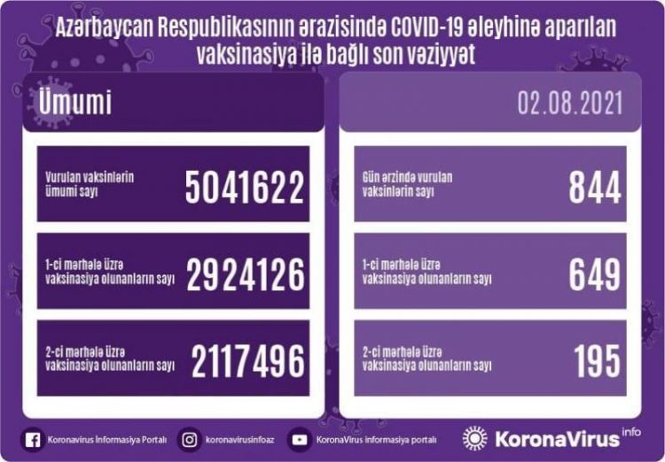 Qeyd edilib ki, bir gündə birinci mərhələ üzrə vaksinasiya olunanların sayı 649, ikinci mərhələ üzrə vaksinasiya olunanların sayı 195 nəfərdir.