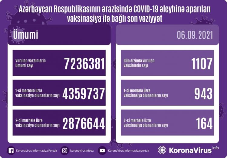 Ölkədə vurulan vaksinlərin ümumi sayı 7 236 381, birinci mərhələ üzrə vaksinasiya olunanların ümumi sayı 4 359 737, ikinci mərhələ üzrə vaksinasiya olunanların sayı isə 2 876 644 təşkil edir.