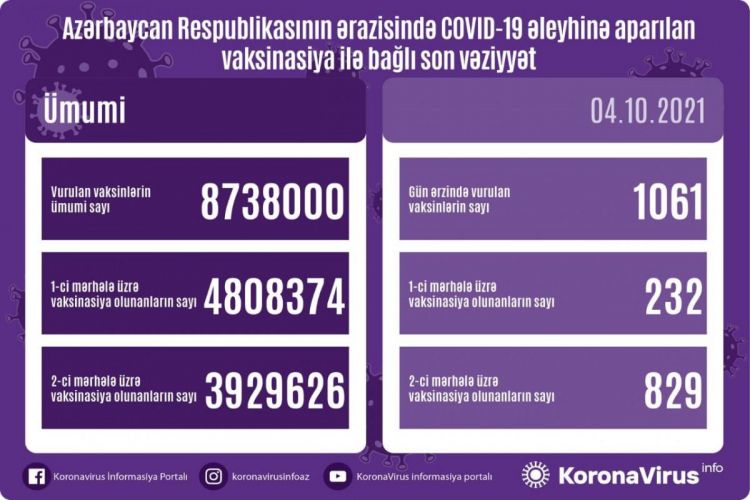 Ölkədə vurulan vaksinlərin ümumi sayı 8 738 000, birinci mərhələ üzrə vaksinasiya olunanların ümumi sayı 4 808 374, ikinci mərhələ üzrə vaksinasiya olunanların sayı isə 3 929 626 təşkil edir.